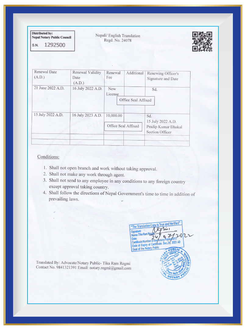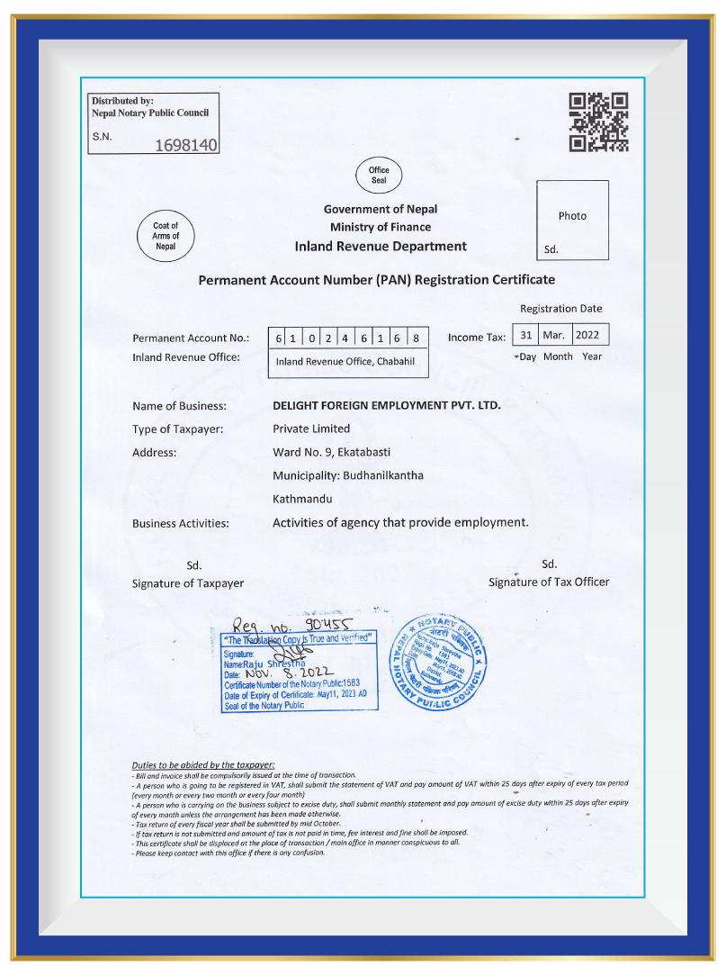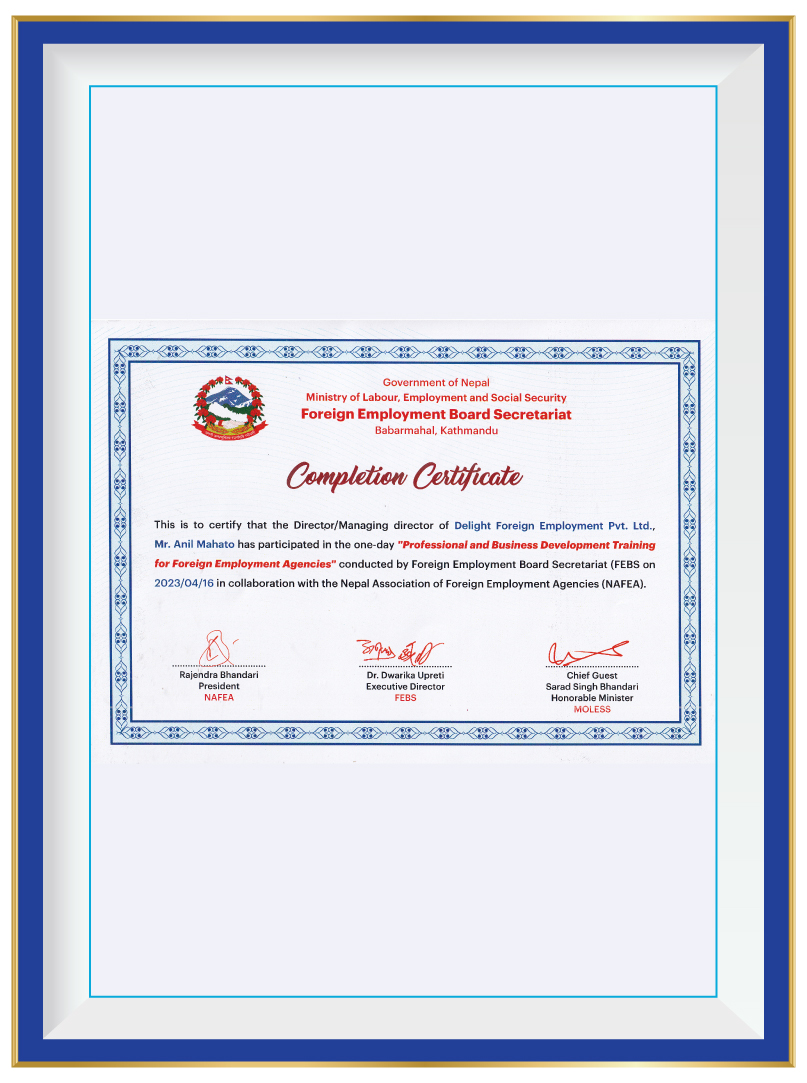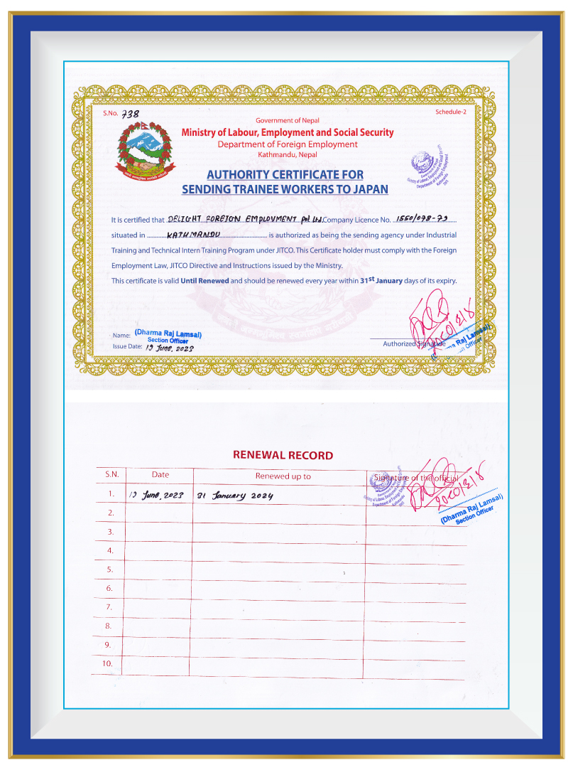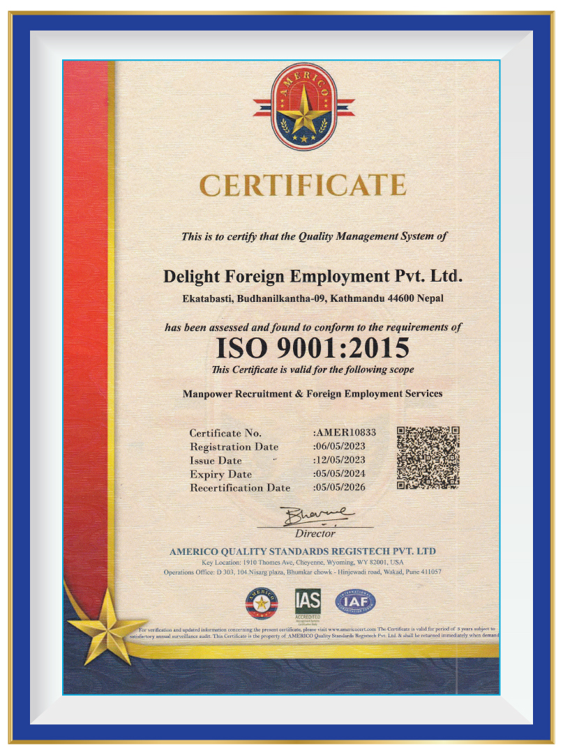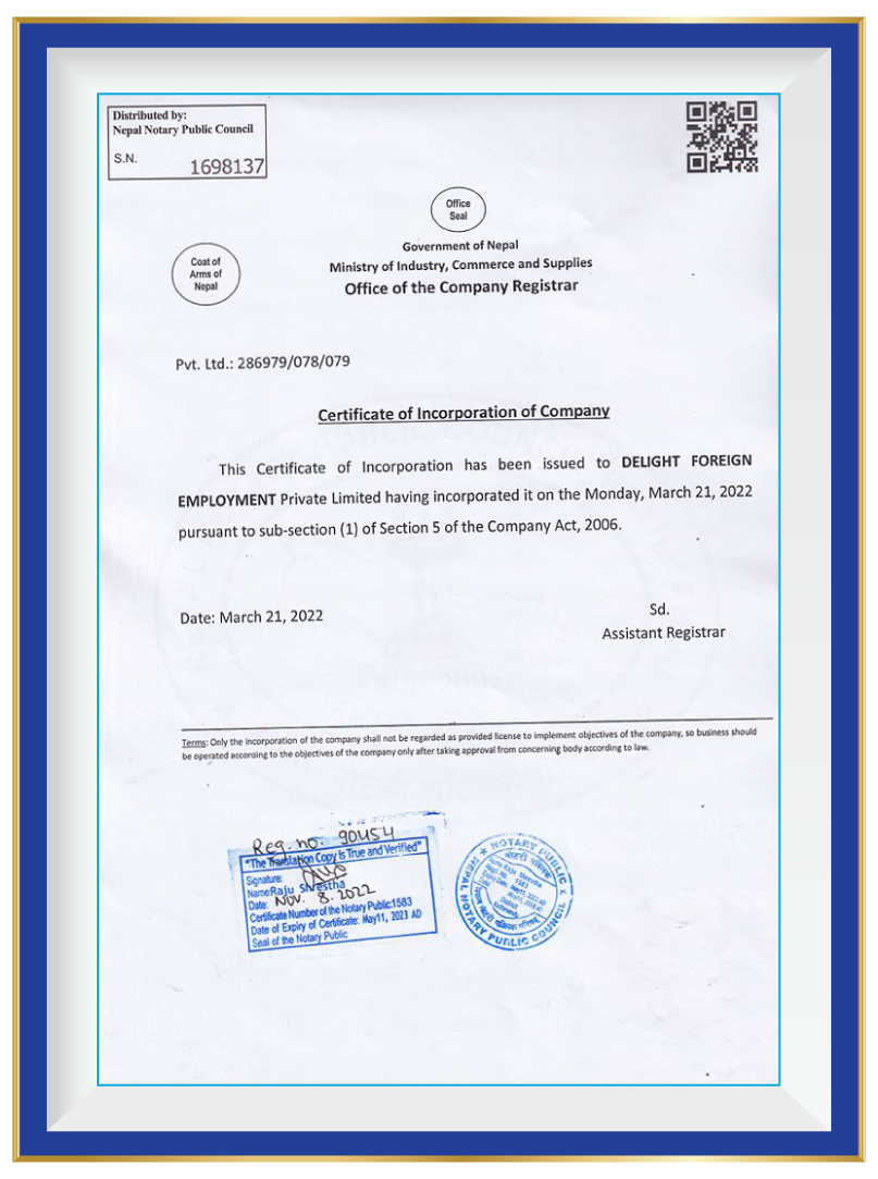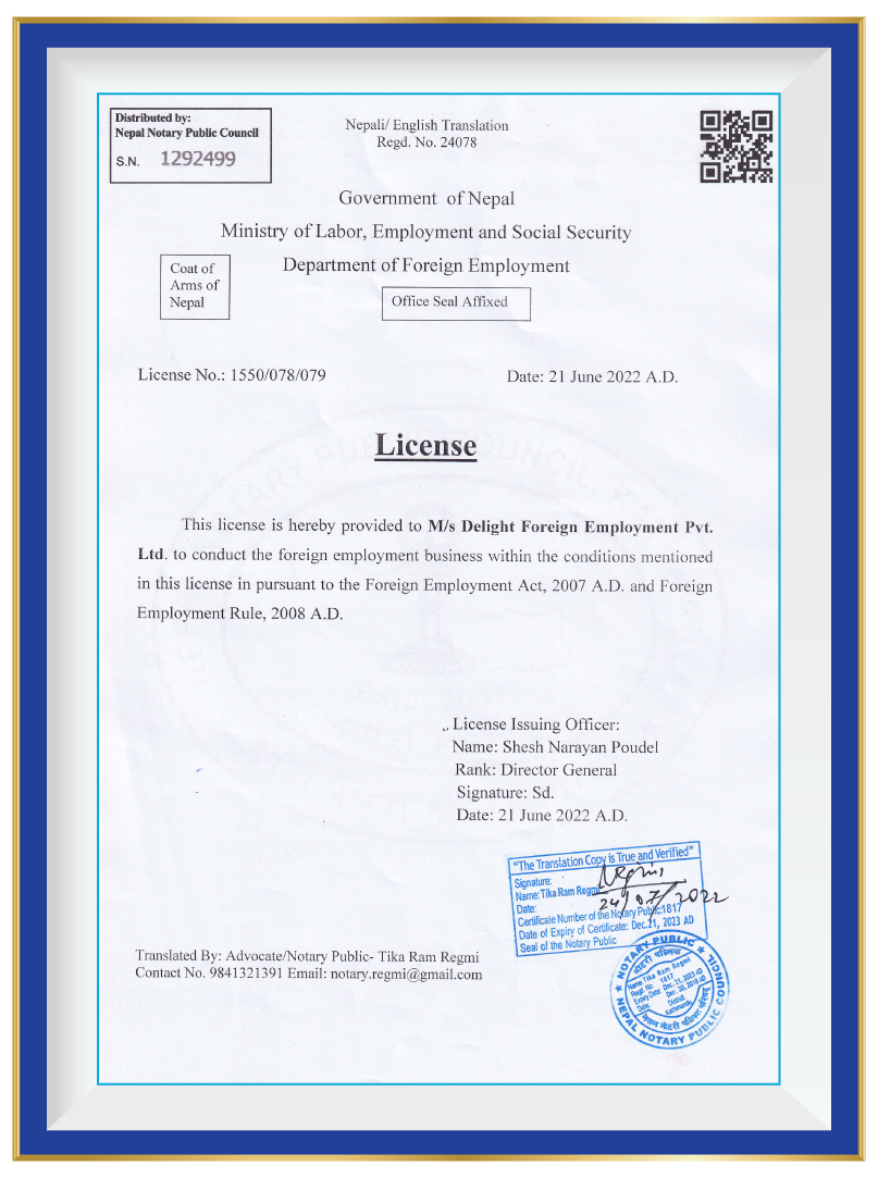 At Delight Foreign Employment Pvt. Ltd., we take immense pride in our commitment to operating as a reputable and reliable recruitment agency. As a testament to our unwavering dedication, we are pleased to highlight our legal document registrations that solidify our compliance with government regulations and industry standards.Government of Nepal Ministry of Labour & Employment Secretariat of Foreign Employment Promotion Board has granted us a distinguished Government License with the number 1550/078/079. This license signifies our compliance with the regulations set forth by the Ministry and assures our clients and candidates that we operate within the legal framework established for foreign employment. We are registered with the Government of Nepal Ministry of Industry, Commerce & Supplies Office of the Company Registrar, holding the registration number 286979/078/079. This registration further reinforces our commitment to conducting business in a transparent and lawful manner, adhering to the regulations and guidelines set by the Ministry. These legal document registrations serve as a strong foundation for our operations, providing reassurance to our clients and candidates that we maintain the highest level of professionalism and adhere to stringent ethical standards. They underscore our dedication to upholding the trust placed in us and provide a solid framework for delivering reliable and trustworthy recruitment services.